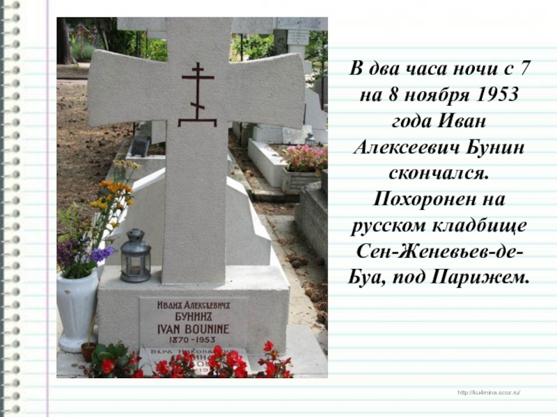 года Иван Алексеевич Бунин скончался. Похоронен на русском кладбище Сен-Женевьев-де-Буа,