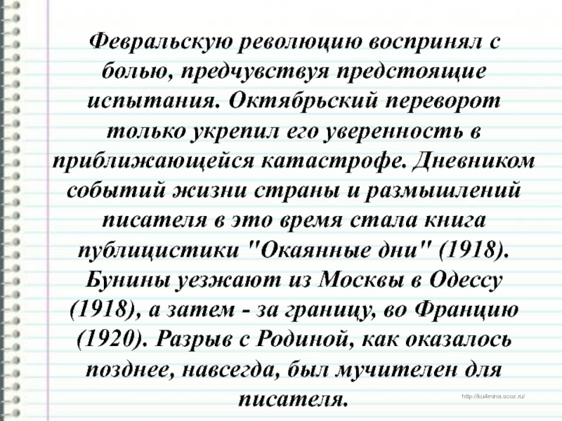 страны и размышлений писателя в это время стала книга публицистики "Окаянные дни" (1918). Бунины уезжают из Москвы в Одессу (1918), а затем - за границу, во Францию (1920). Разрыв с Родиной, как оказалось позднее, навсегда, был мучителен для писателя.