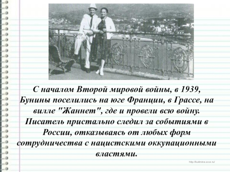 Слайд 18С началом Второй мировой войны, в 1939, Бунины поселились на