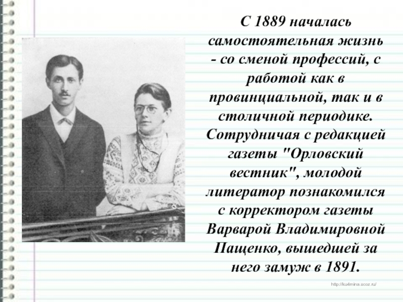 с редакцией газеты "Орловский вестник", молодой литератор познакомился с корректором газеты Варварой Владимировной Пащенко, вышедшей за него замуж в 1891.