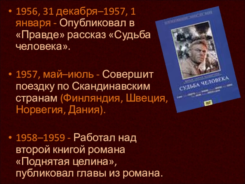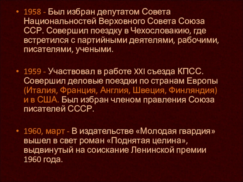 1958–1959 - Работал над второй книгой романа «Поднятая целина», публиковал главы из романа.