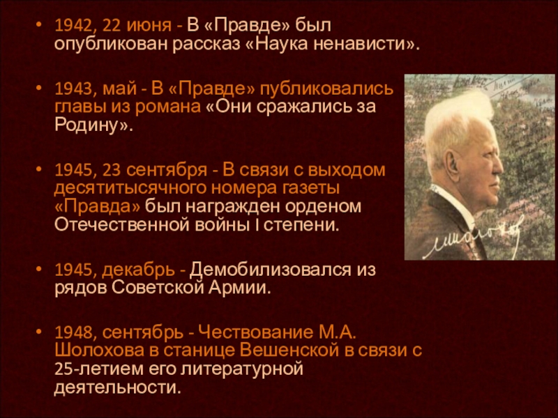 1945, 23 сентября - В связи с выходом десятитысячного номера газеты «Правда» был награжден орденом Отечественной войны I степени.