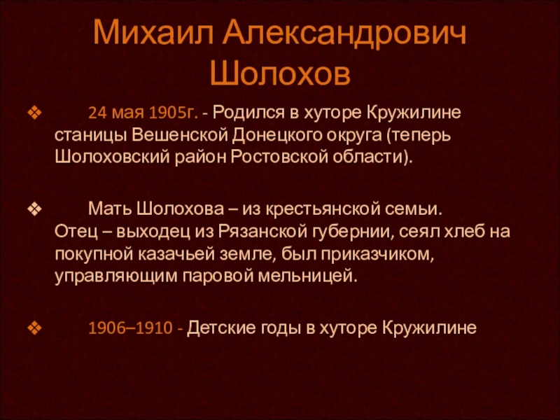 Мать Шолохова – из крестьянской семьи. Отец – выходец из Рязанской губернии, сеял хлеб на покупной казачьей земле, был приказчиком, управляющим паровой мельницей.