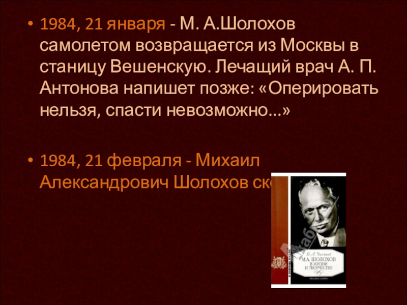 Слайд 241984, 21 января - М. А.Шолохов самолетом возвращается из Москвы