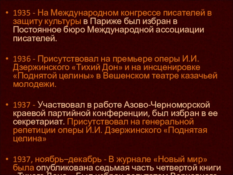 1935–1937 - Напряженно работал над четвертой книгой «Тихого Дона».