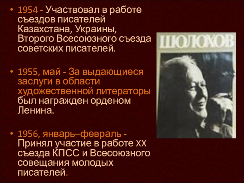 1954 - Участвовал в работе съездов писателей Казахстана, Украины,