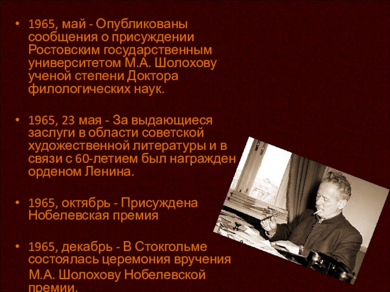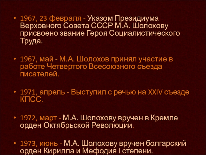 1975, 22 мая - М.А. Шолохов был награжден орденом Ленина. Правительство Болгарии наградило М.А. Шолохова орденом Георгия Димитрова. Софийский городской совет депутатов трудящихся присудил М.А. Шолохову за выдающийся вклад в развитие мировой литературы международную литературную премию «София».