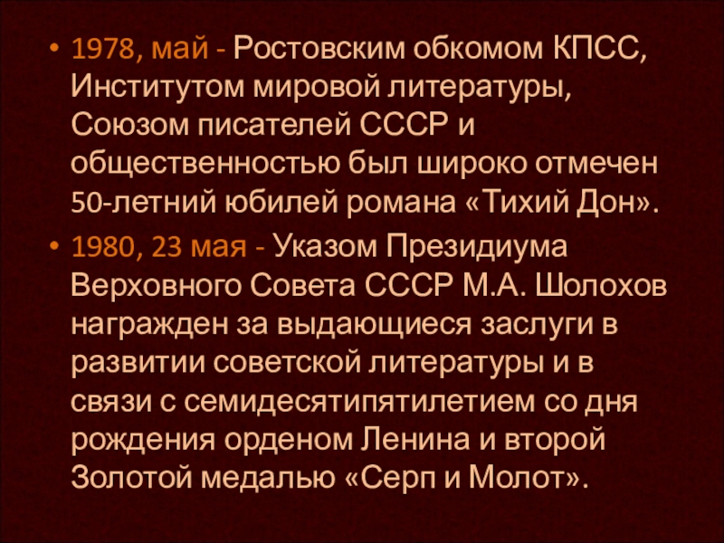 1980, 23 мая - Указом Президиума Верховного Совета СССР М.А. Шолохов награжден за выдающиеся заслуги в развитии советской литературы и в связи с семидесятипятилетием со дня рождения орденом Ленина и второй Золотой медалью «Серп и Молот».