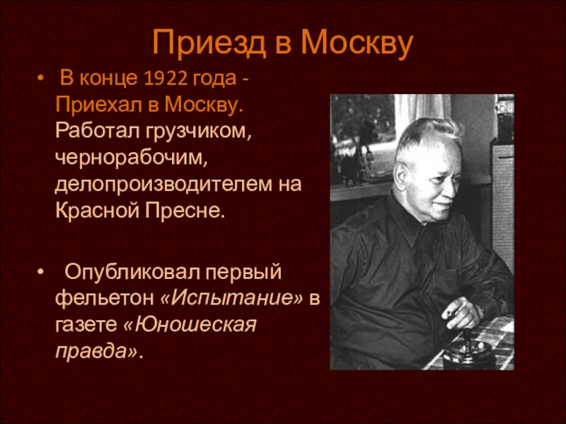 Москву. Работал грузчиком, чернорабочим, делопроизводителем на Красной Пресне.