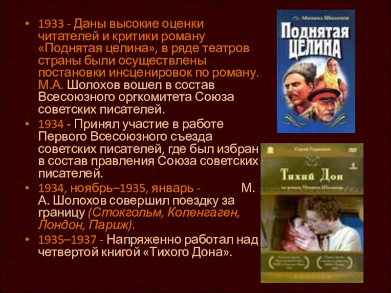 по роману. М.А. Шолохов вошел в состав Всесоюзного оргкомитета Союза советских писателей.