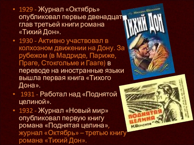 1932 - Журнал «Новый мир» опубликовал первую книгу романа «Поднятая целина», журнал «Октябрь» – третью книгу романа «Тихий Дон».