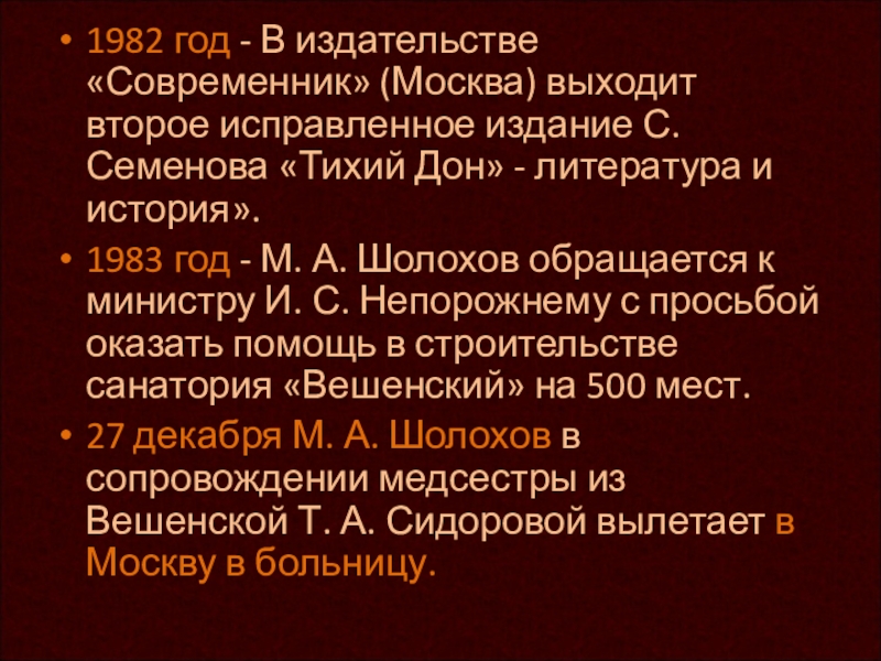 год - М. А. Шолохов обращается к министру И. С. Непорожнему с просьбой оказать помощь в строительстве санатория «Вешенский» на 500 мест.
