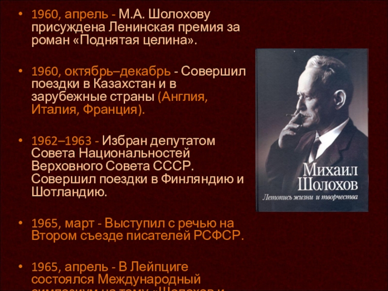 1960, март - В издательстве «Молодая гвардия» вышел в свет роман «Поднятая целина», выдвинутый на соискание Ленинской премии 1960 года.