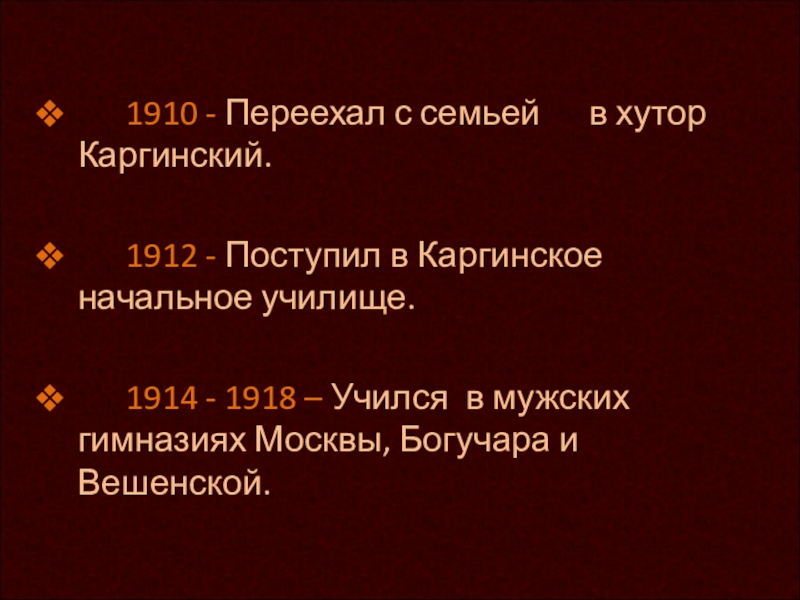 1914 - 1918 – Учился в мужских гимназиях Москвы, Богучара и Вешенской.
