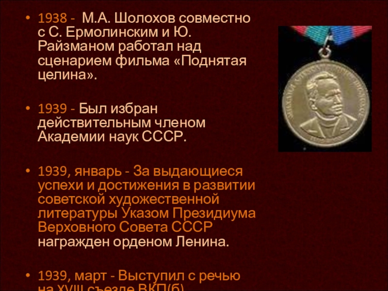 марта - За роман «Тихий Дон» постановлением Совета Народных Комиссаров М.А. Шолохову присуждена Государственная премия.