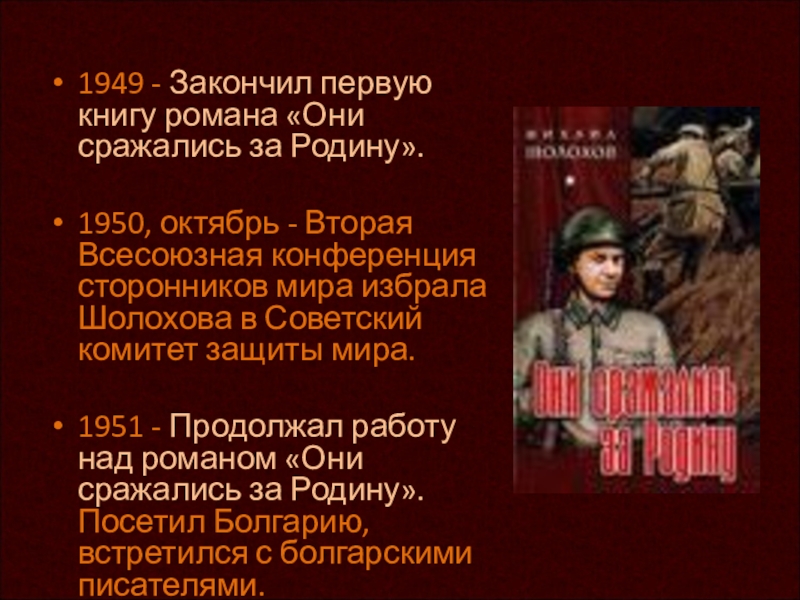 1949 - Закончил первую книгу романа «Они сражались за