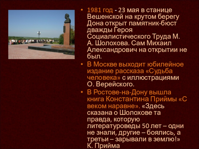 Слайд 221981 год - 23 мая в станице Вешенской на крутом