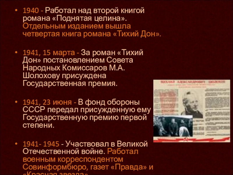 1940 - Работал над второй книгой романа «Поднятая целина».