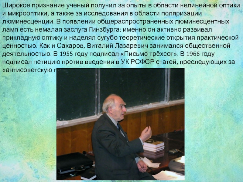 В появлении общераспространенных люминесцентных ламп есть немалая заслуга Гинзбурга: именно он активно развивал прикладную оптику и наделял сугубо теоретические открытия практической ценностью. Как и Сахаров, Виталий Лазаревич занимался общественной деятельностью. В 1955 году подписал «Письмо трёхсот». В 1966 году подписал петицию против введения в УК РСФСР статей, преследующих за «антисоветскую пропаганду и агитацию».