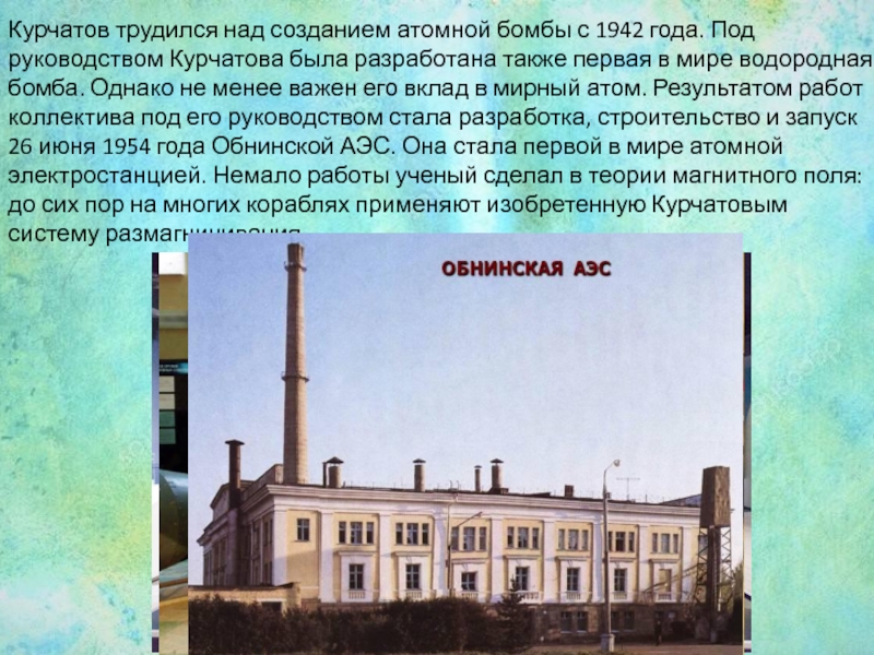 Слайд 3Курчатов трудился над созданием атомной бомбы с 1942 года. Под