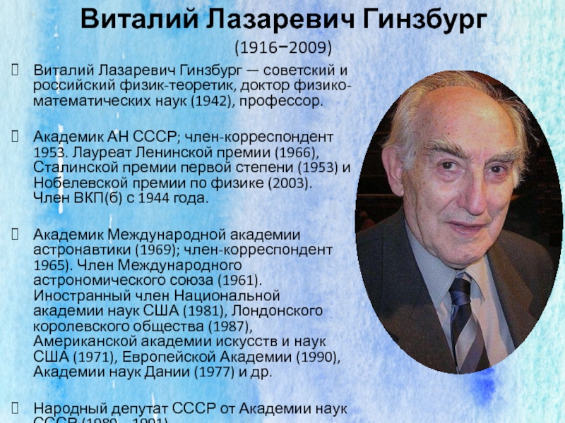 Слайд 10Виталий Лазаревич Гинзбург (1916−2009)