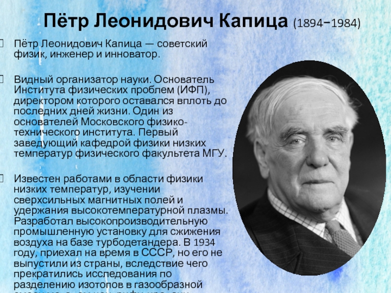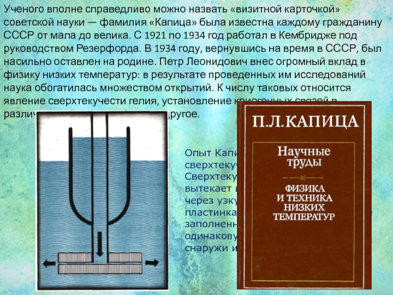 велика. С 1921 по 1934 год работал в Кембридже под руководством Резерфорда. В 1934 году, вернувшись на время в СССР, был насильно оставлен на родине. Петр Леонидович внес огромный вклад в физику низких температур: в результате проведенных им исследований наука обогатилась множеством открытий. К числу таковых относится явление сверхтекучести гелия, установление криогенных связей в различных веществах и многое другое.