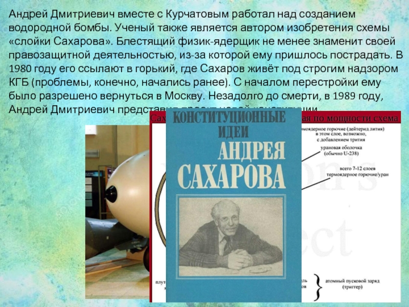 Слайд 5Андрей Дмитриевич вместе с Курчатовым работал над созданием водородной бомбы.