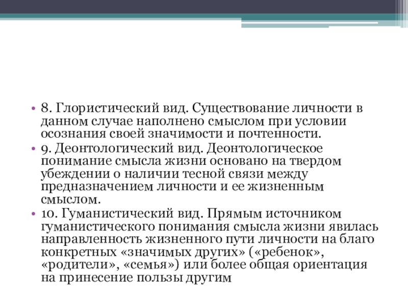 10. Гуманистический вид. Прямым источником гуманистического понимания смысла жизни явилась направленность жизненного пути личности на благо конкретных «значимых других» («ребенок», «родители», «семья») или более общая ориентация на принесение пользы другим