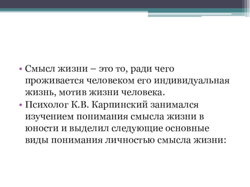 понимания смысла жизни в юности и выделил следующие основные виды понимания личностью смысла жизни: