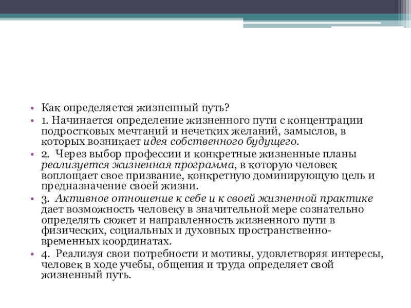 3. Активное отношение к себе и к своей жизненной практике дает возможность человеку в значительной мере сознательно определять сюжет и направленность жизненного пути в физических, социальных и духовных пространственно-временных координатах.