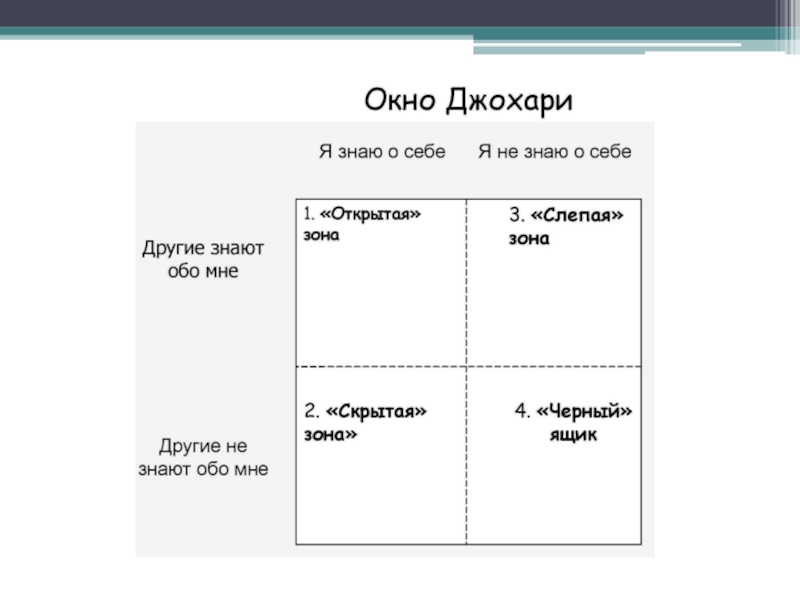 4. «Неизвестная зона» - сведения об индивиде, которые не ему самому, ни окружающим не известны.