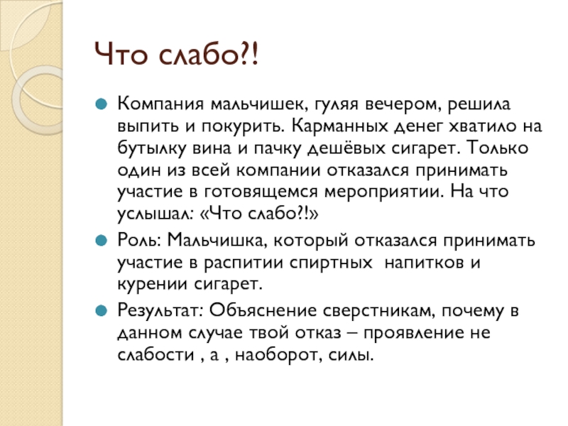 один из всей компании отказался принимать участие в готовящемся мероприятии. На что услышал: «Что слабо?!»Роль: Мальчишка, который отказался принимать участие в распитии спиртных напитков и курении сигарет.