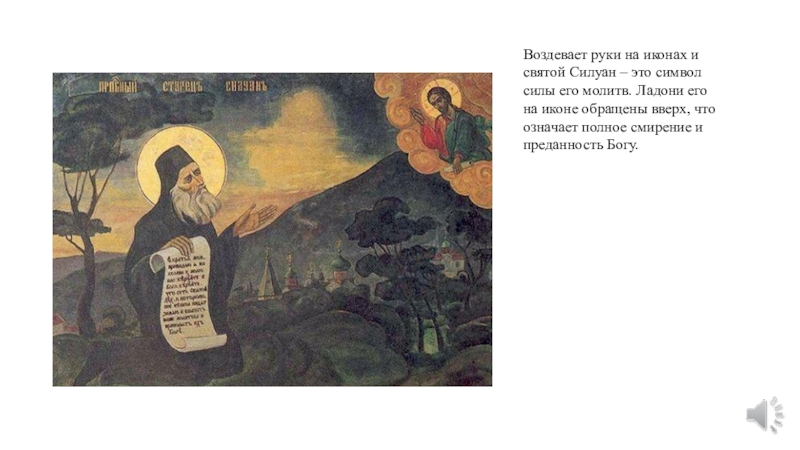 Слайд 16Воздевает руки на иконах и святой Силуан – это символ