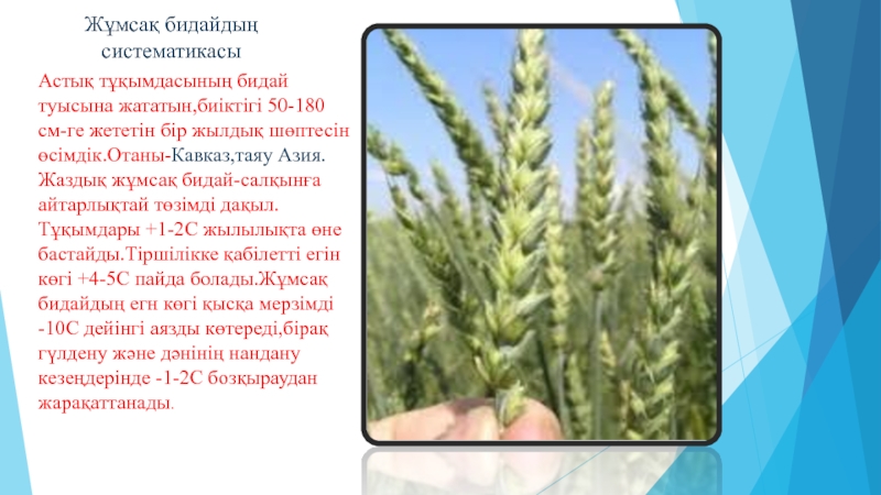 бір жылдық шөптесін өсімдік.Отаны-Кавказ,таяу Азия.Жаздық жұмсақ бидай-салқынға айтарлықтай төзімді дақыл.Тұқымдары