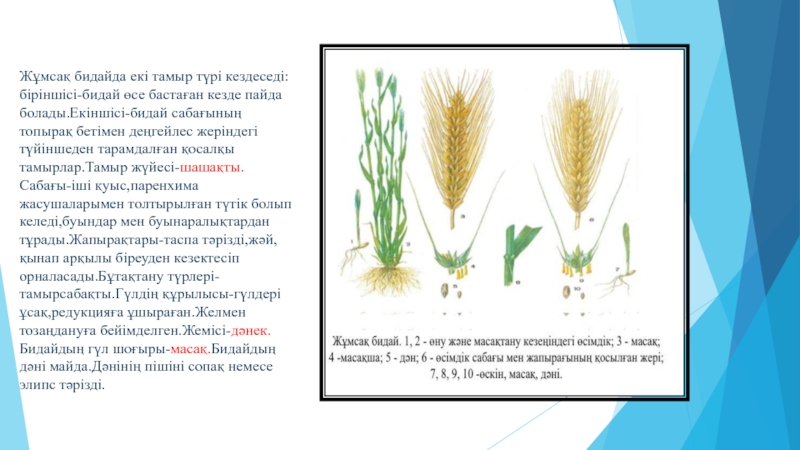 Слайд 4Жұмсақ бидайда екі тамыр түрі кездеседі:біріншісі-бидай өсе бастаған кезде пайда