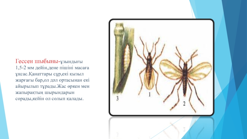 Слайд 9Гессен шыбыны-ұзындығы 1,5-2 мм дейін,дене пішіні масаға ұқсас.Қанаттары сұр,екі қызыл