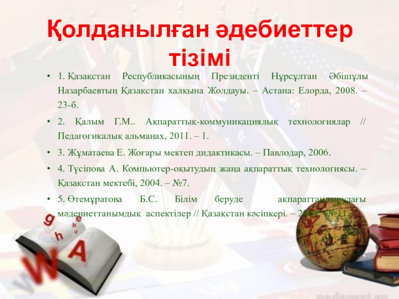 4. Түсіпова А. Компьютер-оқытудың жаңа ақпараттық технологиясы. – Қазақстан мектебі, 2004. – №7.