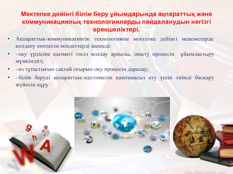 Слайд 8Мектепке дейінгі білім беру ұйымдарында ақпараттық және коммуникациялық технологияларды пайдаланудын