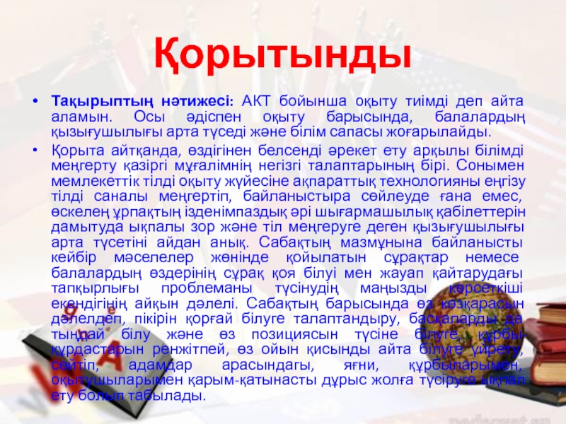 Қорыта айтқанда, өздігінен белсенді әрекет ету арқылы білімді меңгерту қазіргі мұғалімнің негізгі талаптарының бірі. Сонымен мемлекеттік тілді оқыту жүйесіне ақпараттық технологияны еңгізу тілді саналы меңгертіп, байланыстыра сөйлеуде ғана емес, өскелең ұрпақтың ізденімпаздық әрі шығармашылық қабілеттерін дамытуда ықпалы зор және тіл меңгеруге деген қызығушылығы арта түсетіні айдан анық. Сабақтың мазмұнына байланысты кейбір мәселелер жөнінде қойылатын сұрақтар немесе балалардың өздерінің сұрақ қоя білуі мен жауап қайтарудағы тапқырлығы проблеманы түсінудің маңызды көрсеткіші екендігінің айқын дәлелі. Сабақтың барысында өз көзқарасын дәлелдеп, пікірін қорғай білуге талаптандыру, басқаларды да тыңдай білу және өз позициясын түсіне білуге, құрбы-құрдастарын ренжітпей, өз ойын қисынды айта білуге үйрету, сөйтіп, адамдар арасындагы, яғни, құрбыларымен, оқытушыларымен қарым-қатынасты дұрыс жолға түсіруге ықпал ету болып табылады.