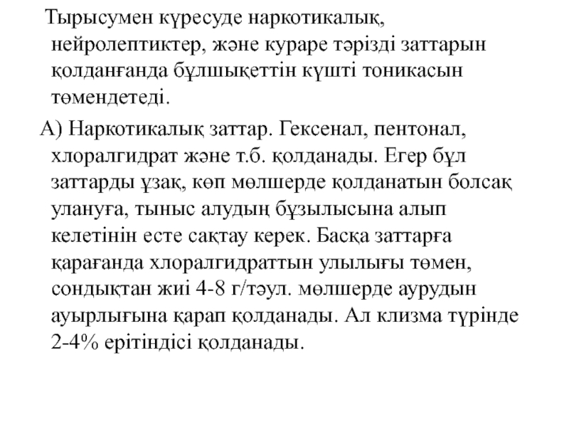 Слайд 37 Тырысумен күресуде наркотикалық, нейролептиктер, және кураре тәрізді заттарын қолданғанда