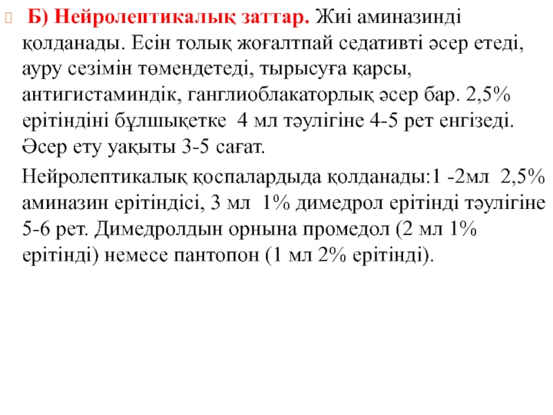 Слайд 38 Б) Нейролептикалық заттар. Жиі аминазинді қолданады. Есін толық жоғалтпай