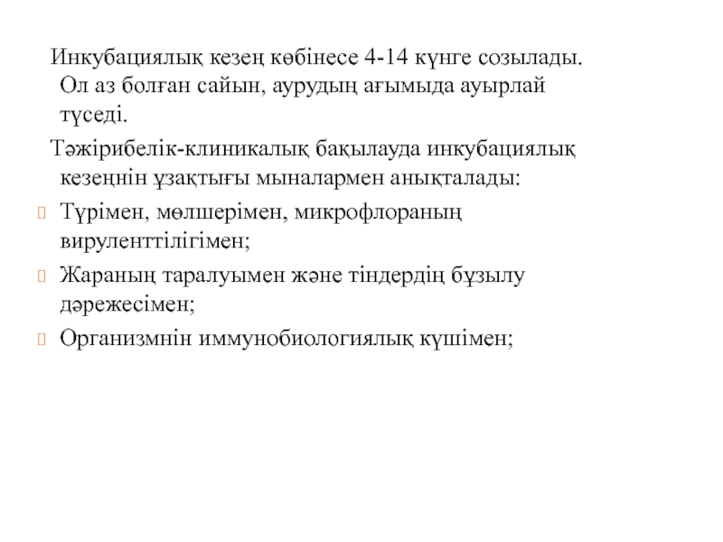 Слайд 4 Инкубациялық кезең көбінесе 4-14 күнге созылады. Ол аз болған