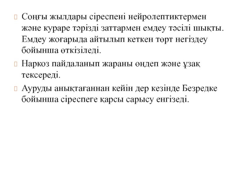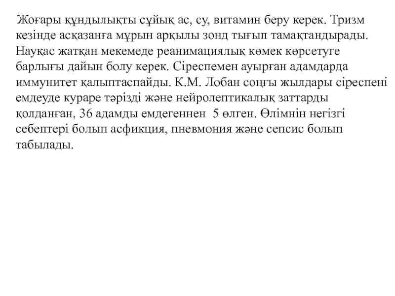 Слайд 34Соңғы жылдары сіреспені нейролептиктермен және кураре тәрізді заттармен емдеу тәсілі