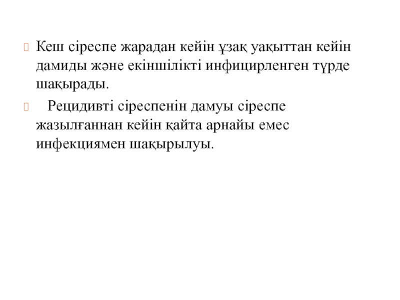 Слайд 20Кеш сіреспе жарадан кейін ұзақ уақыттан кейін дамиды және екіншілікті