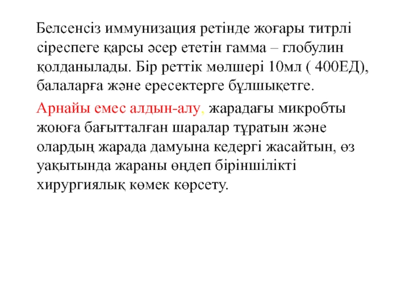 Слайд 28 Белсенсіз иммунизация ретінде жоғары титрлі сіреспеге қарсы әсер