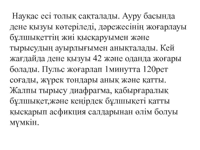 Слайд 17 Науқас есі толық сақталады. Ауру басында дене қызуы көтеріледі,