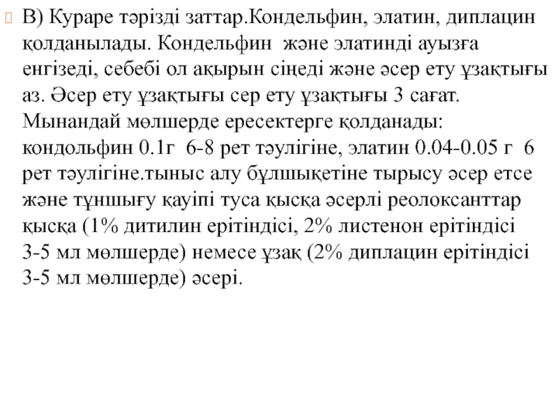 Слайд 39В) Кураре тәрізді заттар.Кондельфин, элатин, диплацин қолданылады. Кондельфин және элатинді