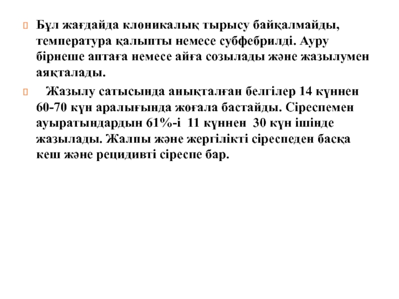 Слайд 19Бұл жағдайда клоникалық тырысу байқалмайды, температура қалыпты немесе субфебрилді. Ауру