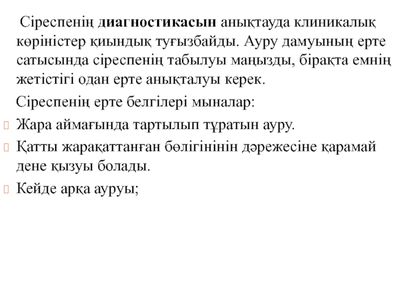 Слайд 24 Сіреспенің диагностикасын анықтауда клиникалық көріністер қиындық туғызбайды. Ауру