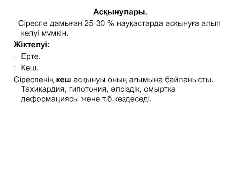 Сіреспенің кеш асқынуы оның ағымына байланысты. Тахикардия, гипотония, әлсіздік,